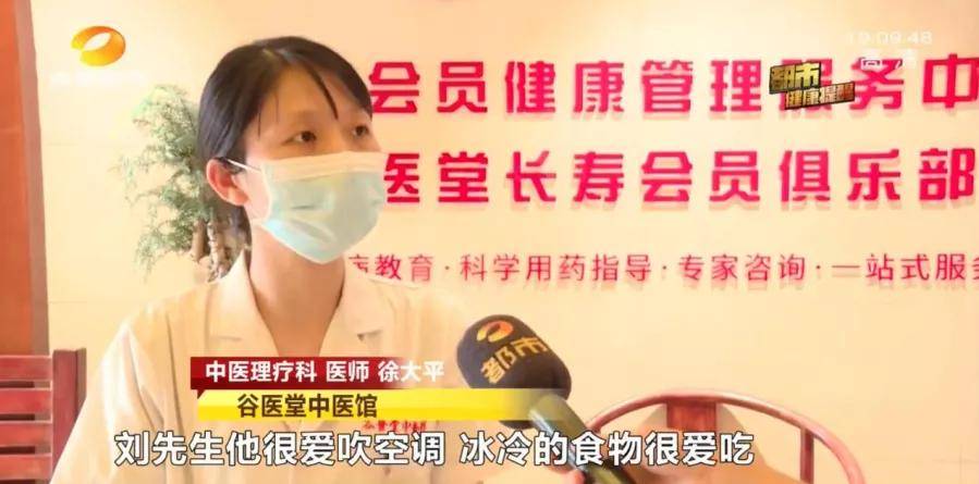 刘先生感到既难受又十分不便,连忙来到家附近的谷医堂中医馆找中医调理。中医馆的理疗师徐大平仔细询问了他的发病及生活情况,了解到他近段时间来总是长时间吹空调,又爱吃冰西瓜、冰啤酒等冰冷的食物,而这正是导致他发病的原因。