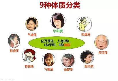 九种体质包括:平和质、气虚质、阳虚质、阴虚质、痰湿质、湿热质、血瘀质、气郁质、特禀质。一种为平和,八种属偏颇。