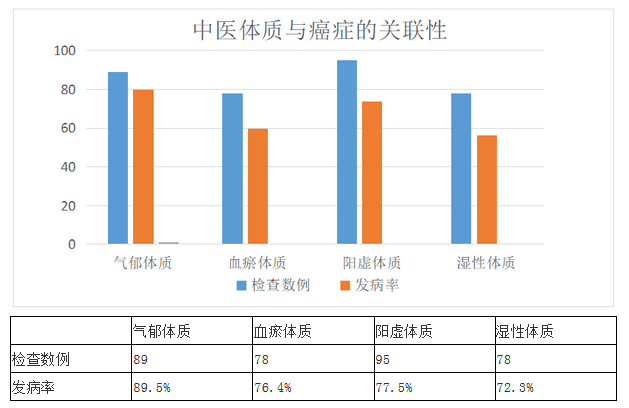 其中包括气郁体质、血瘀体质、阳虚体质、湿性体质。四种中医体质偏颇的肿瘤发病率统计:气郁体质偏颇调査检测例数 89 例,发病率为